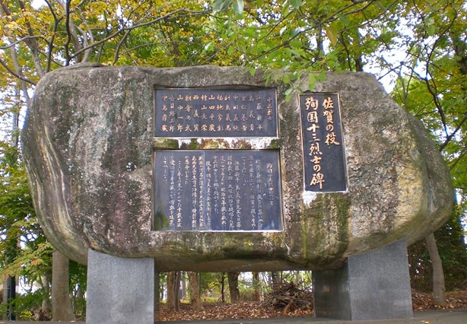 佐賀戦争の首謀者と目されて刑死させられた江藤新平や島義勇ら13名をしのび、募金活動により昭和58(1983)年に建立されました。